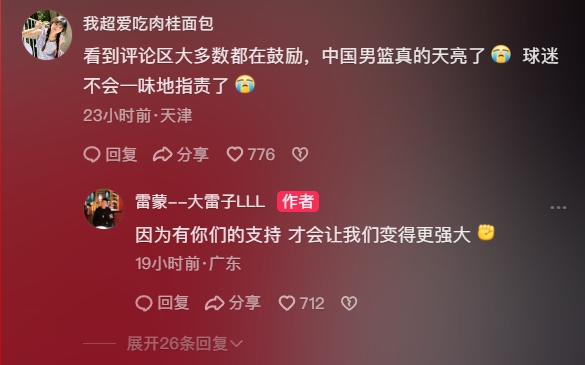 有網(wǎng)友在評論區回復:“看到評論區大多數都在鼓勵,中國男籃真的天亮了??球迷不會(huì )一味地指責了??!”