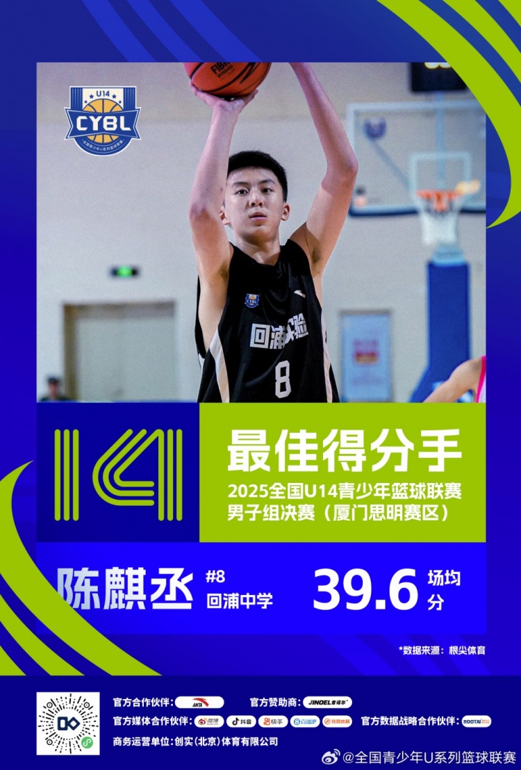 全國U14青少年聯(lián)賽男子組單項數據榜:陳麒丞場(chǎng)均39.6分榮膺得分王