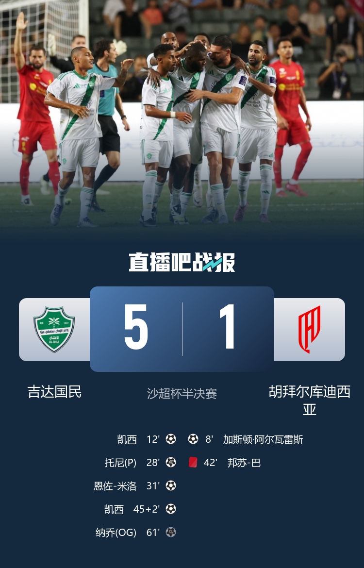 全場(chǎng)比賽結束,吉達國民5-1擊敗庫迪西亞晉級沙超杯決賽,他們將對陣利雅得勝利。