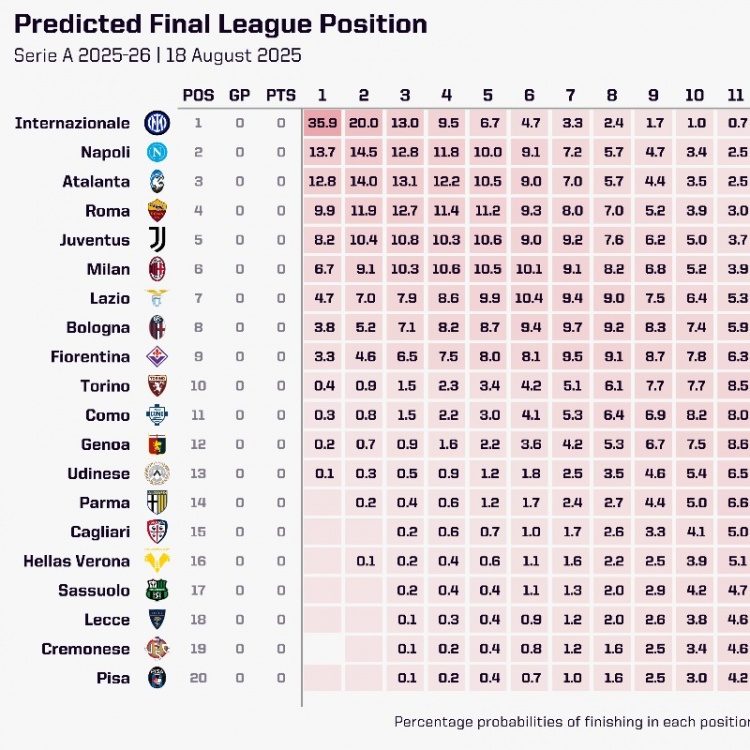 8月21日訊 opta通過(guò)超級計算機預測本賽季意甲排名,國米有35.9%的概率奪冠,在奪冠概率上那不勒斯、亞特蘭大分列二三位。