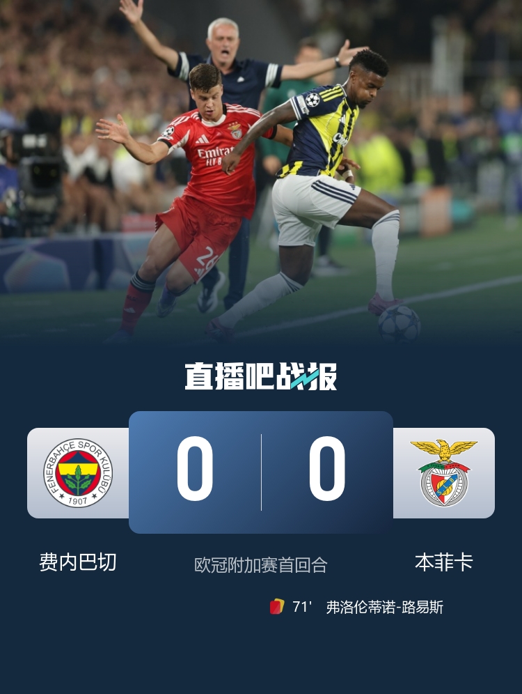 8月21日訊 歐冠附加賽首回合,費內巴切坐鎮主場(chǎng)薩拉克格魯球場(chǎng)迎戰本菲卡。上半場(chǎng),阿克圖爾科格魯任意球被撲。易邊再戰,弗洛倫蒂諾-路易斯兩黃被罰下,恩內斯里補射被吹。最終費內巴切0-0本菲卡。雙方次回合將在28日凌晨移師本菲卡主場(chǎng)。