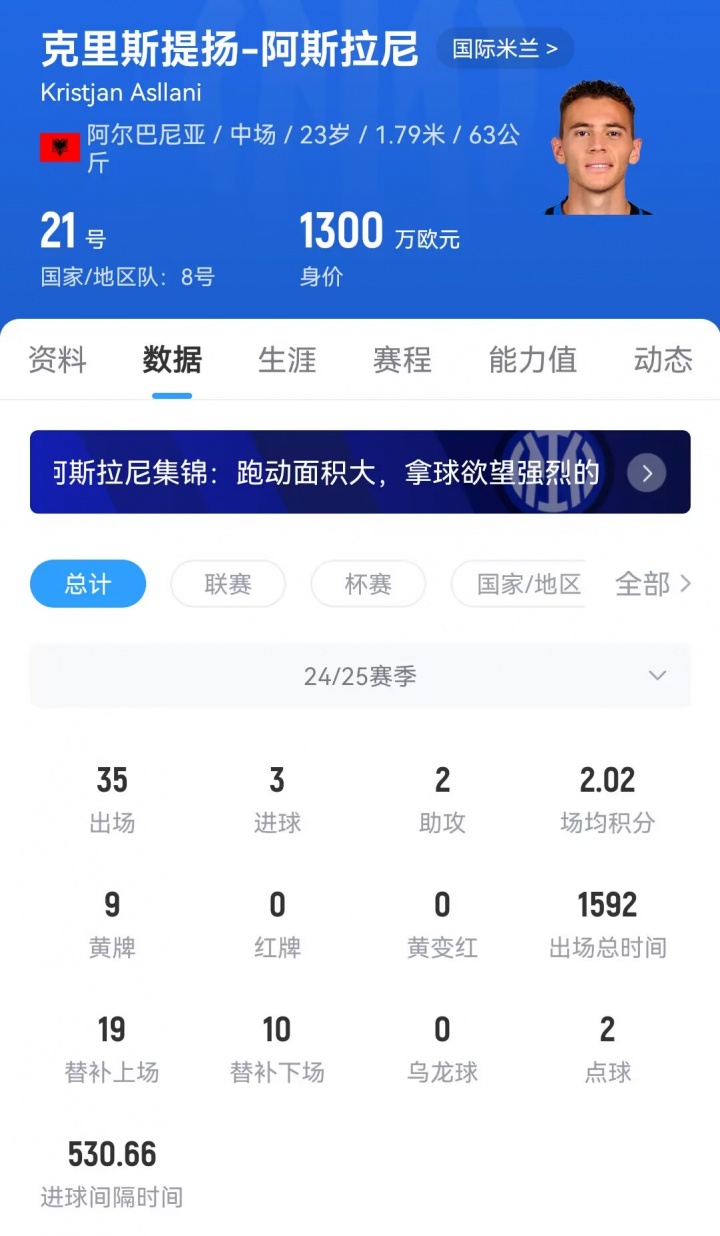 阿斯拉尼現年23歲,司職中場(chǎng)。國米在2023年以1570萬(wàn)簽下阿斯拉尼,效力球隊至今,阿斯拉尼出場(chǎng)99次,貢獻4球5助,目前球員德轉身價(jià)為1300萬(wàn)歐元。