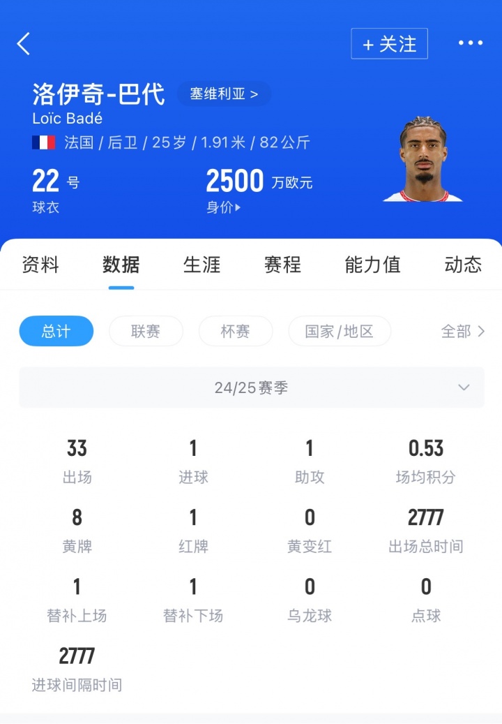 巴代現年25歲,身高1米91,上賽季為塞維利亞出場(chǎng)33場(chǎng),現身價(jià)2500萬(wàn)歐元。