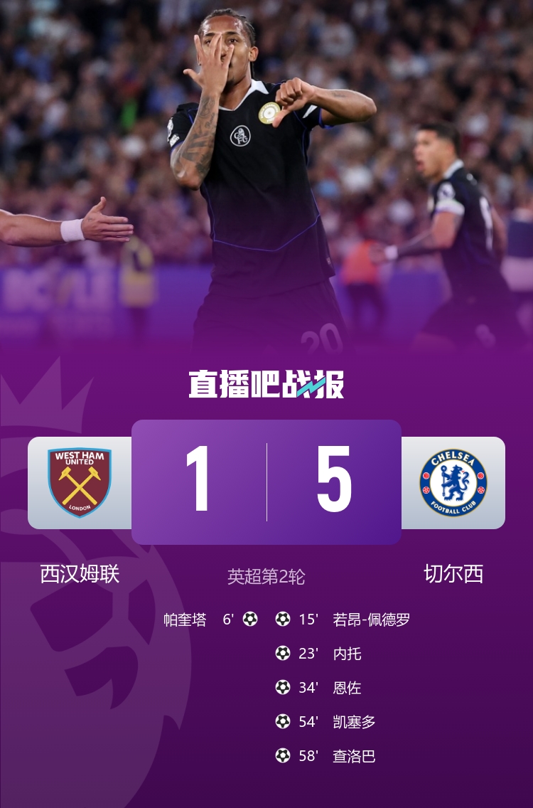 8月23日訊 北京時(shí)間3:00,英超第2輪西漢姆聯(lián)vs切爾西,比賽在倫敦碗打響!上半場(chǎng),帕奎塔6分鐘世界波破門(mén)!若昂-佩德羅頭球破門(mén)迅速扳平!菲爾克魯格破門(mén)被吹越位;隨后若昂-佩德羅助攻內托反超比分,埃斯特旺助攻恩佐再下一城!下半場(chǎng),凱塞多、查洛巴均在角球中破門(mén),大量西漢姆聯(lián)球迷59分鐘早早離場(chǎng)!最終,切爾西5-1大勝西漢姆聯(lián),取得賽季首勝!西漢姆聯(lián)遭遇2連??!