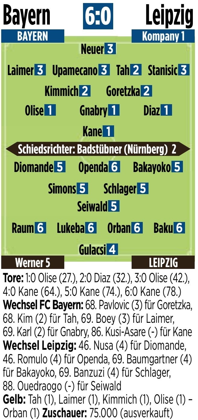 8月23日訊 德甲首輪比賽,拜仁主場(chǎng)6-0擊敗萊比錫,《圖片報》對兩隊球員和教練進(jìn)行了評分,凱恩、迪亞斯、格納布里、奧利塞1分最高。