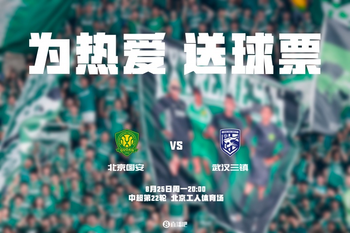 8月25日下周一20:00,中超第22輪北京國安坐鎮主場(chǎng)對陣武漢三鎮,小吧繼續為吧友帶來(lái)球票福利!