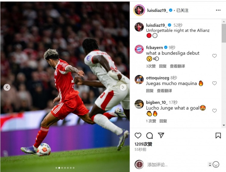 德甲首秀1射2傳!迪亞斯社媒:安聯(lián)球場(chǎng)的難忘夜晚????