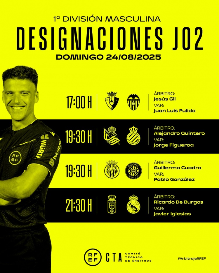 8月23日訊 西甲官方更新社媒動(dòng)態(tài),公布了當地時(shí)間8月24日(本周日)四場(chǎng)比賽的裁判安排。