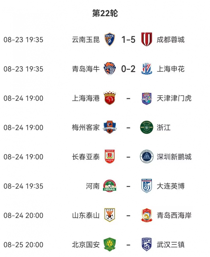08月23日訊 中超第22輪的前兩場(chǎng)比賽結束,蓉城5-1客勝玉昆,申花2-0客勝海牛。