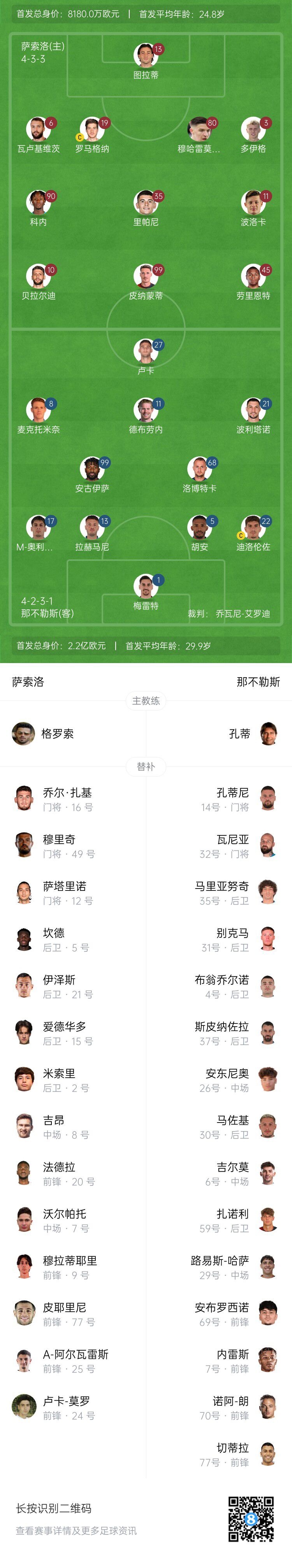 8月24日訊 00:30意甲聯(lián)賽第一輪,那不勒斯客場(chǎng)對陣薩索洛。賽前,雙方公布了本場(chǎng)比賽的首發(fā)陣容。