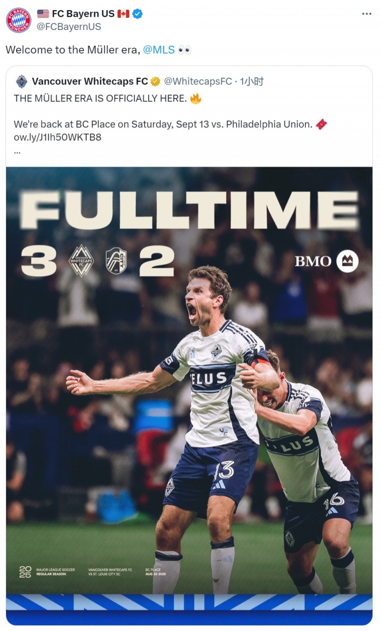 拜仁官方社媒轉發(fā)溫哥華白浪的海報,并@美職聯(lián),配文:“歡迎來(lái)到穆勒時(shí)代?!?/p>