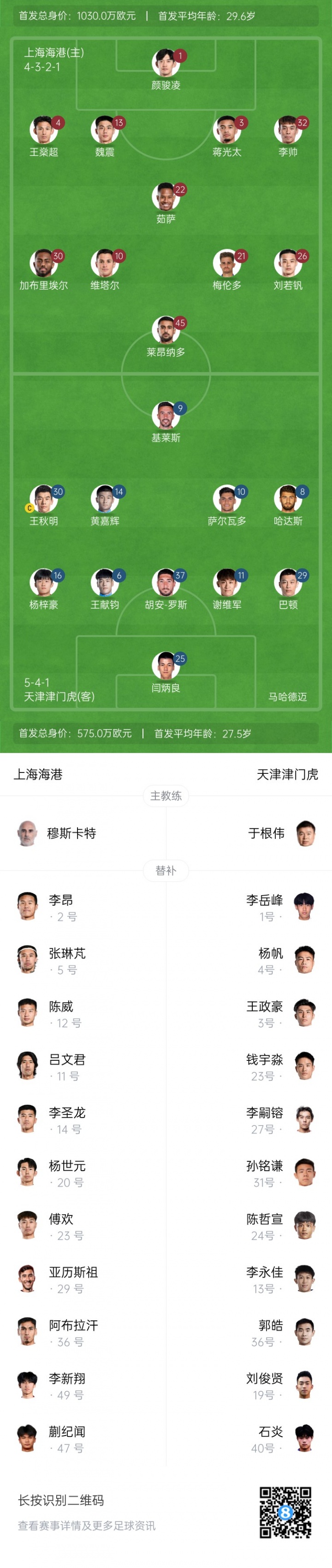 08月24日訊 北京時(shí)間今晚19點(diǎn),中超第22輪,上海海港主場(chǎng)迎戰天津津門(mén)虎,賽前雙方公布首發(fā)陣容。