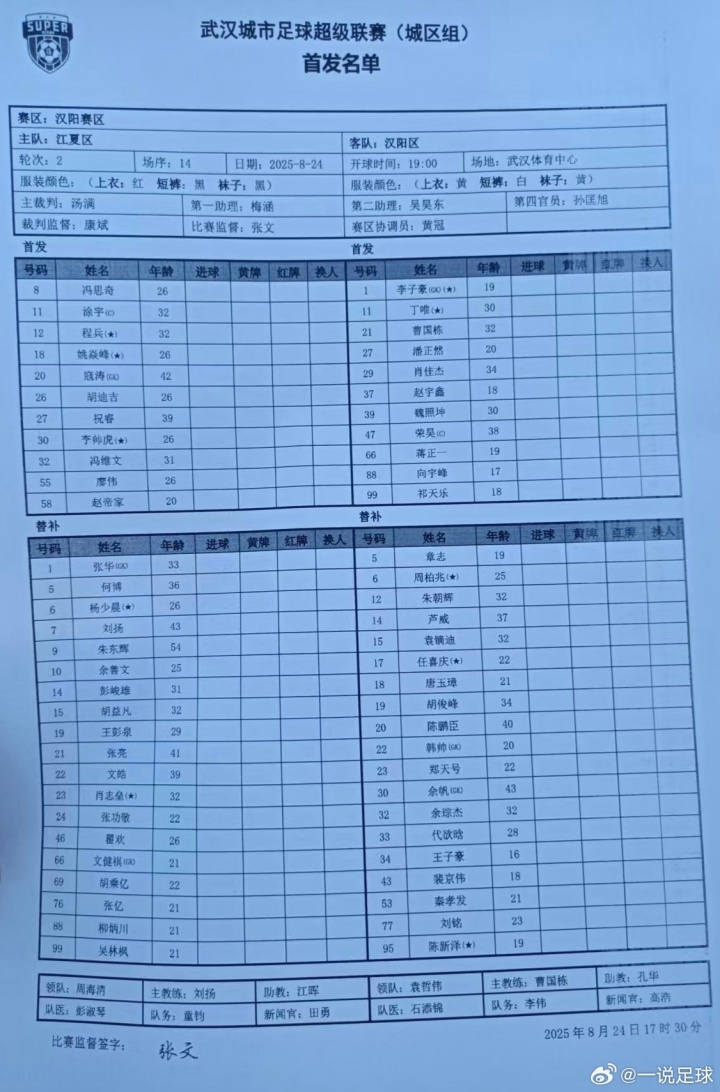 武漢城市足球超級聯(lián)賽(漢超),江夏區vs漢陽(yáng)區的首發(fā)名單公布,38歲的前國腳榮昊代表漢陽(yáng)區先發(fā)出戰,并擔任隊長(cháng)。