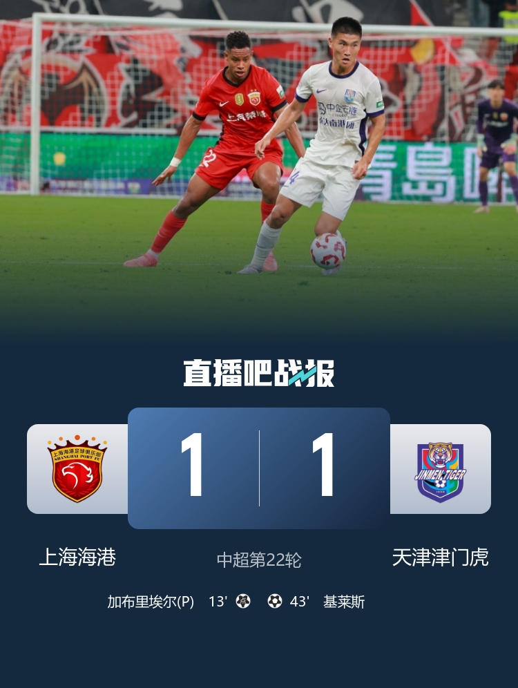 08月24日訊 中超第22輪,天津津門(mén)虎客場(chǎng)1-1戰平上海海港,終結了對海港的5連敗。