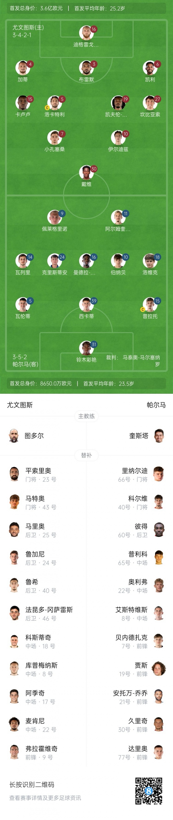 尤文圖斯首發(fā):16-迪格雷戈里奧、4-加蒂、3-布雷默、6-凱利、15-卡盧盧、5-洛卡特利、19-凱夫倫-圖拉姆、27-坎比亞索、7-孔塞桑、10-伊爾迪茲、30-戴維