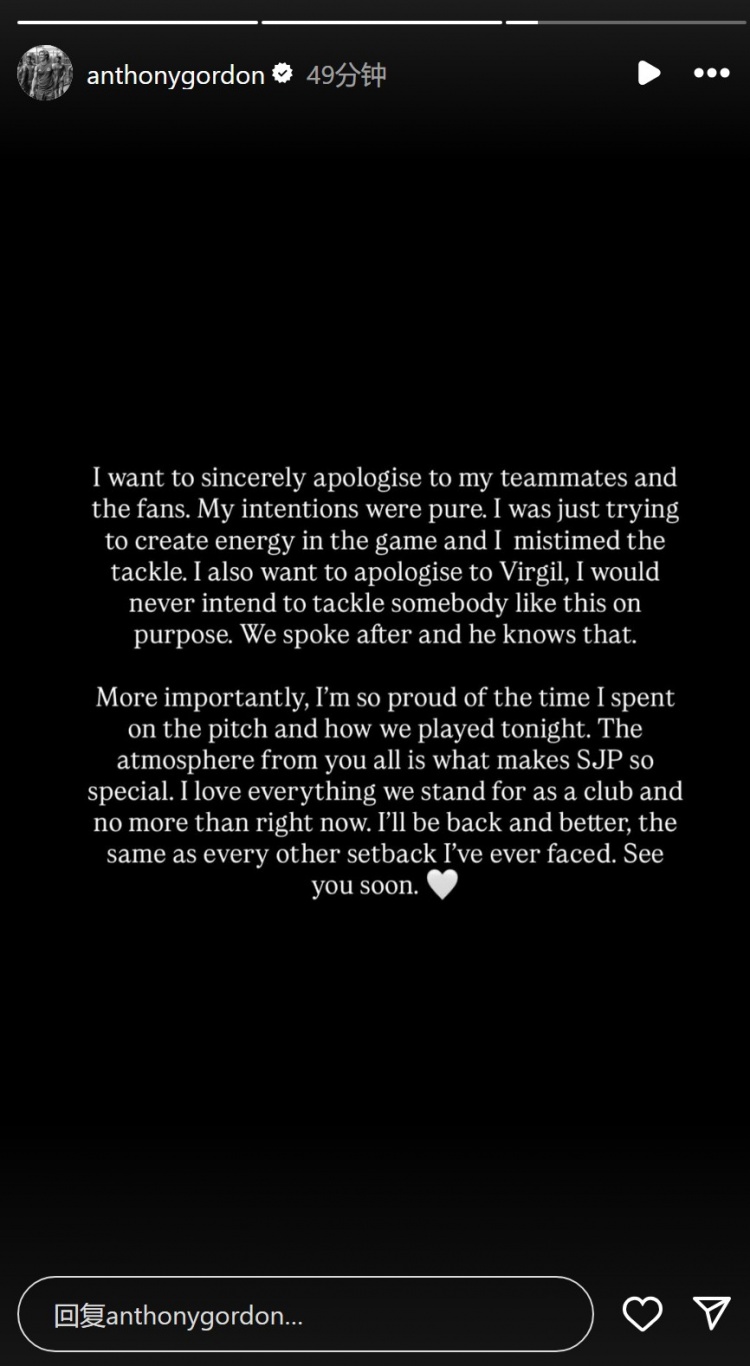 戈登賽后在社交媒體上寫(xiě)道:“我想要真誠地向我的隊友和球迷們道歉。我的意圖很單純,我只是想在比賽中激發(fā)一些活力,但這次鏟球時(shí)機把握得不好。我也要向范迪克道歉,我絕不會(huì )故意這樣鏟人。我們之后聊過(guò),他知道這一點(diǎn)。