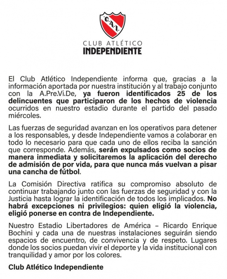 “董事會(huì )重申,我們將繼續與安全部門(mén)和司法部門(mén)合作,直到所有涉案人員都被識別出來(lái)。沒(méi)有例外也沒(méi)有特權:選擇暴力的人就是選擇了站在獨立競技俱樂(lè )部的對立面?!?/p>