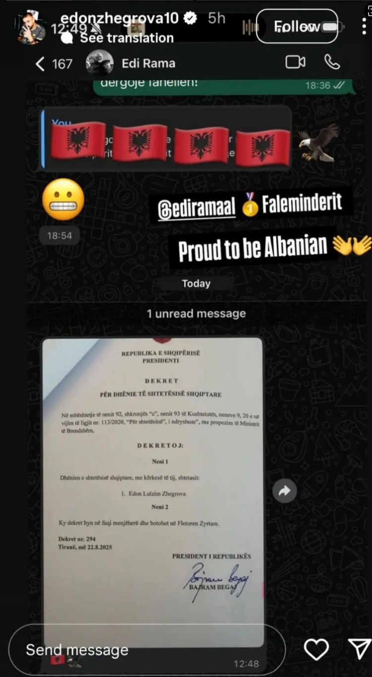 周二,哲格羅瓦在他的Instagram故事中分享了一段與阿爾巴尼亞總統埃迪-拉瑪的WhatsApp對話(huà)片段,顯示他已經(jīng)獲得了阿爾巴尼亞國籍。有趣的是,拉瑪是尤文圖斯的忠實(shí)支持者。
