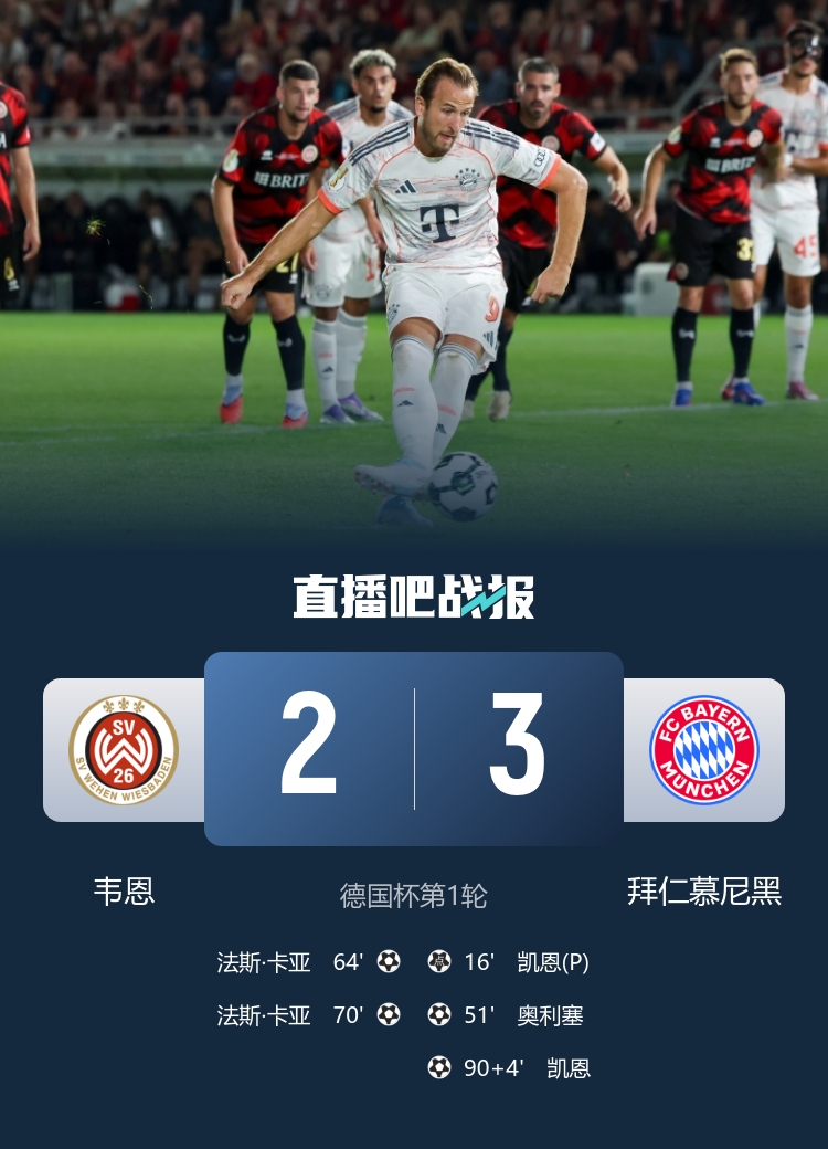 8月28日訊 北京時(shí)間8月28日凌晨2時(shí)45分,2025-26賽季德國杯第1輪在碧然德競技場(chǎng)展開(kāi)角逐,拜仁慕尼黑客場(chǎng)對陣德丙隊韋恩。上半場(chǎng)凱恩點(diǎn)射首開(kāi)記錄,下半場(chǎng)奧利塞擴大比分,迪亞斯屢失良機,卡亞連進(jìn)兩球扳平,凱恩失點(diǎn)+補時(shí)絕殺。最終拜仁客場(chǎng)3-2險勝德丙隊韋恩,晉級德國杯第2輪。