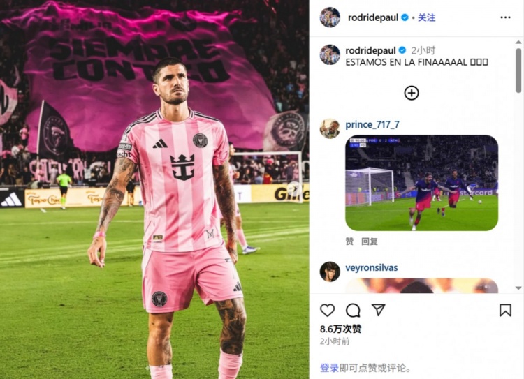 8月28日訊 阿根廷中場(chǎng)德保羅更新社媒,慶祝邁阿密?chē)H晉級聯(lián)盟杯決賽。