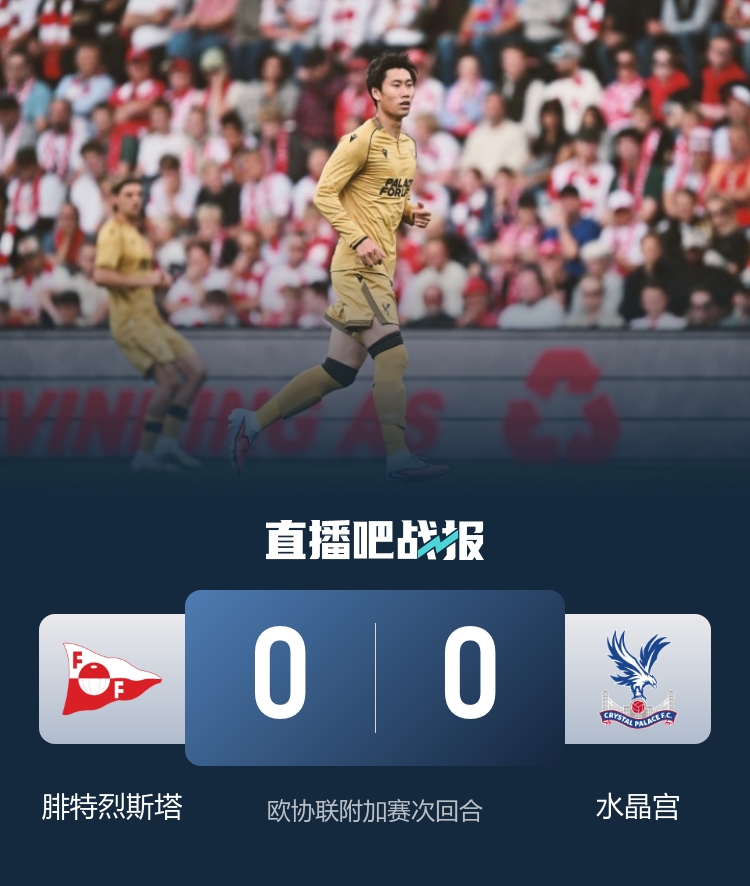 全場(chǎng)比賽結束,水晶宮客場(chǎng)0-0戰平腓特烈斯塔。