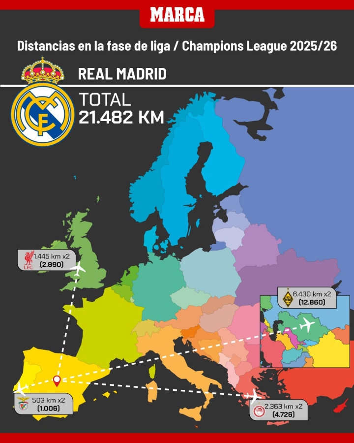 皇馬歐冠客場(chǎng)往返總路程:21482公里