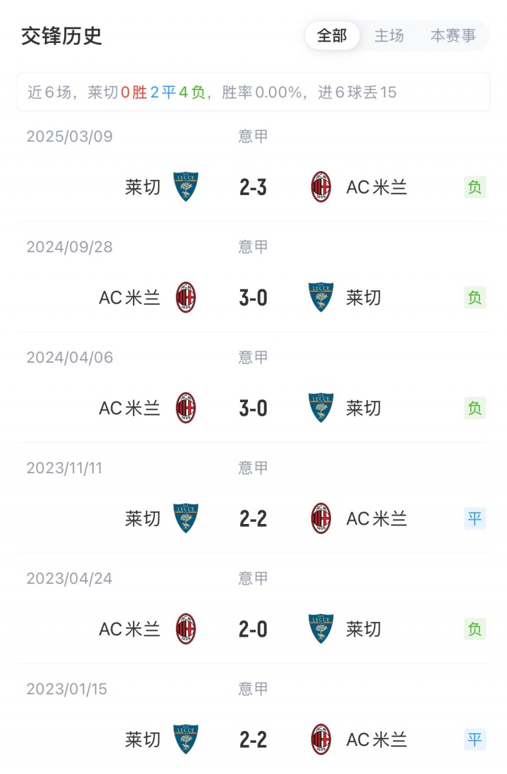 首輪米蘭1-2不敵克雷莫納,萊切0-0戰平熱那亞。米蘭對萊切已14場(chǎng)不敗,戰績(jì)?yōu)?勝5平。