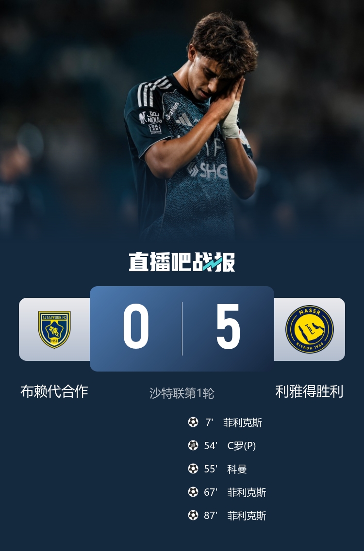 8月30日訊 北京時(shí)間8月30日02:00,沙特聯(lián)首輪利雅得勝利挑戰布賴(lài)代合作的比賽,上半場(chǎng)安吉洛助攻菲利克斯抽射破門(mén)閃擊得手,馬內抽射造險,下半場(chǎng)納瓦夫造點(diǎn),C羅點(diǎn)射打進(jìn)生涯第940球,阿奇迪助攻科曼頭球破門(mén)打進(jìn)勝利生涯首球,馬內助攻菲利克斯抽射破門(mén),菲利克斯補射破門(mén)完成帽子戲法,最終利雅得勝利5-0布賴(lài)代合作取得開(kāi)門(mén)紅。