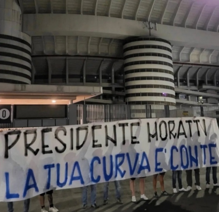 國米球迷組織北看臺拉出橫幅,為莫拉蒂送上祝福,上面寫(xiě)著(zhù):“莫拉蒂主席,你的北看臺與你同在?!?/p>