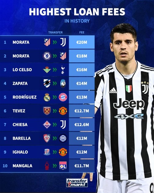 1、莫拉塔 馬競→尤文 2000萬(wàn)歐 (*租期2個(gè)賽季)