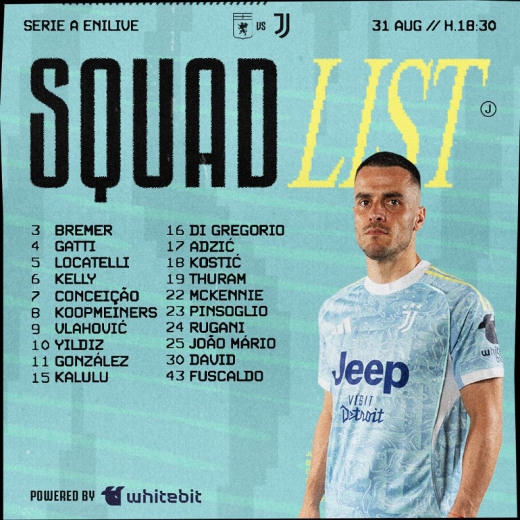 8月30日訊 北京時(shí)間9月1日凌晨1點(diǎn),意甲第2輪,尤文將在客場(chǎng)對陣熱那亞。比賽開(kāi)始前,尤文官方發(fā)布了球隊大名單,布雷默坐鎮后防,伊爾迪茲領(lǐng)銜鋒線(xiàn),弗拉霍維奇入選。