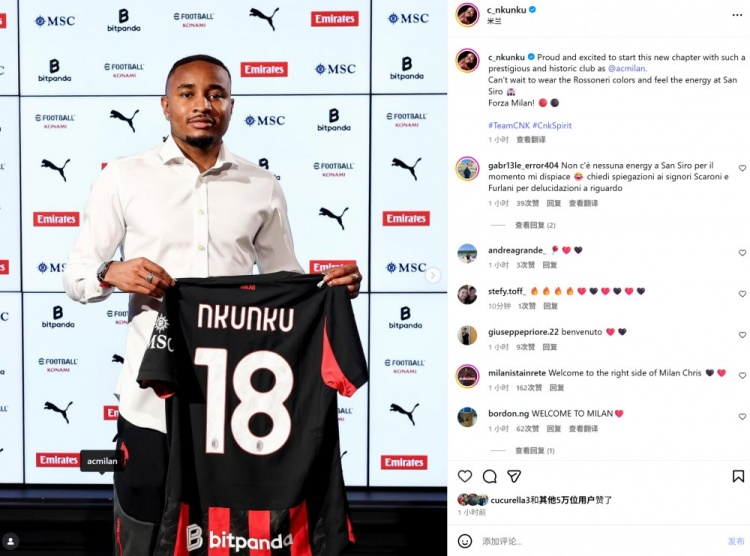 恩昆庫在社媒配文寫(xiě)道:“非常榮幸且激動(dòng)能夠與如此享有盛譽(yù)和歷史悠久的俱樂(lè )部開(kāi)啟新篇章。迫不及待想要穿上紅黑戰袍,在圣西羅球場(chǎng)感受到那份激情。米蘭加油!”