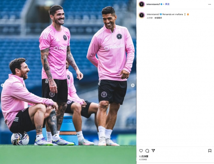 今日邁阿密?chē)H在體育場(chǎng)進(jìn)行了賽前訓練。邁阿密?chē)H曬出了球員訓練照,梅西、德保羅和蘇亞雷斯開(kāi)懷大笑。