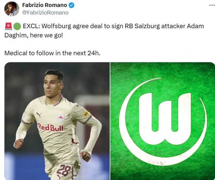 9月1日訊 據知名轉會(huì )專(zhuān)家羅馬諾報道,沃爾夫斯堡即將簽下薩爾茨堡紅牛攻擊手亞當-達吉姆,Here we go!