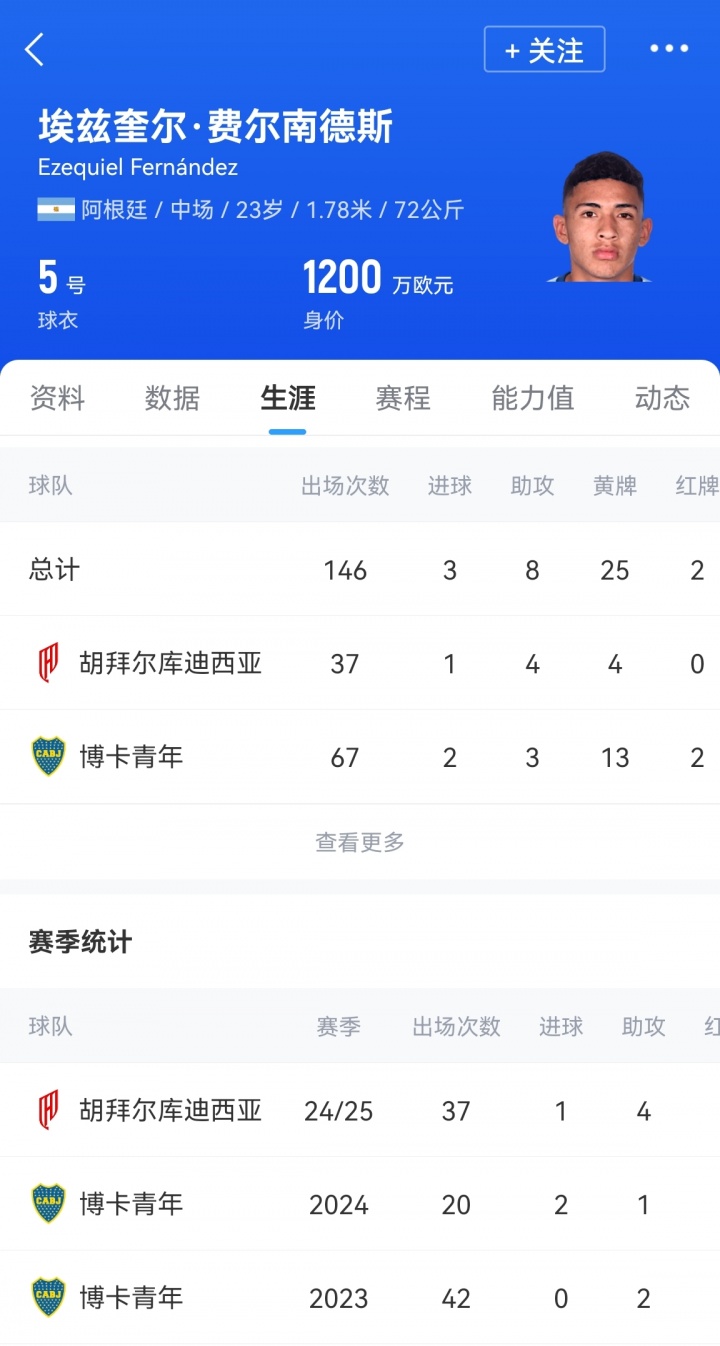 埃茲奎爾-費爾南德斯現年23歲,阿根廷籍,司職防守型中場(chǎng),上賽季各項賽事37場(chǎng)1球4助攻,德轉身價(jià)1200萬(wàn)歐。