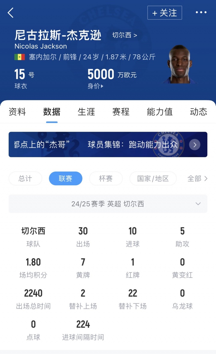杰克遜現年24歲,目前德轉身價(jià)5000萬(wàn)歐,切爾西2023年花費3700萬(wàn)歐從比利亞雷亞爾將其引進(jìn)。上賽季杰克遜為切爾西出戰38場(chǎng)收獲16球5助。