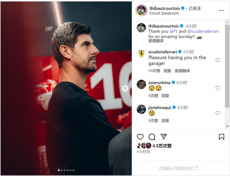 庫爾圖瓦受邀現場(chǎng)觀(guān)看F1荷蘭大獎賽,并造訪(fǎng)法拉利車(chē)隊,他在社交媒體上曬出照片,配文:“感謝F1和法拉利車(chē)隊讓我度過(guò)一個(gè)美妙的周日?!?/p>