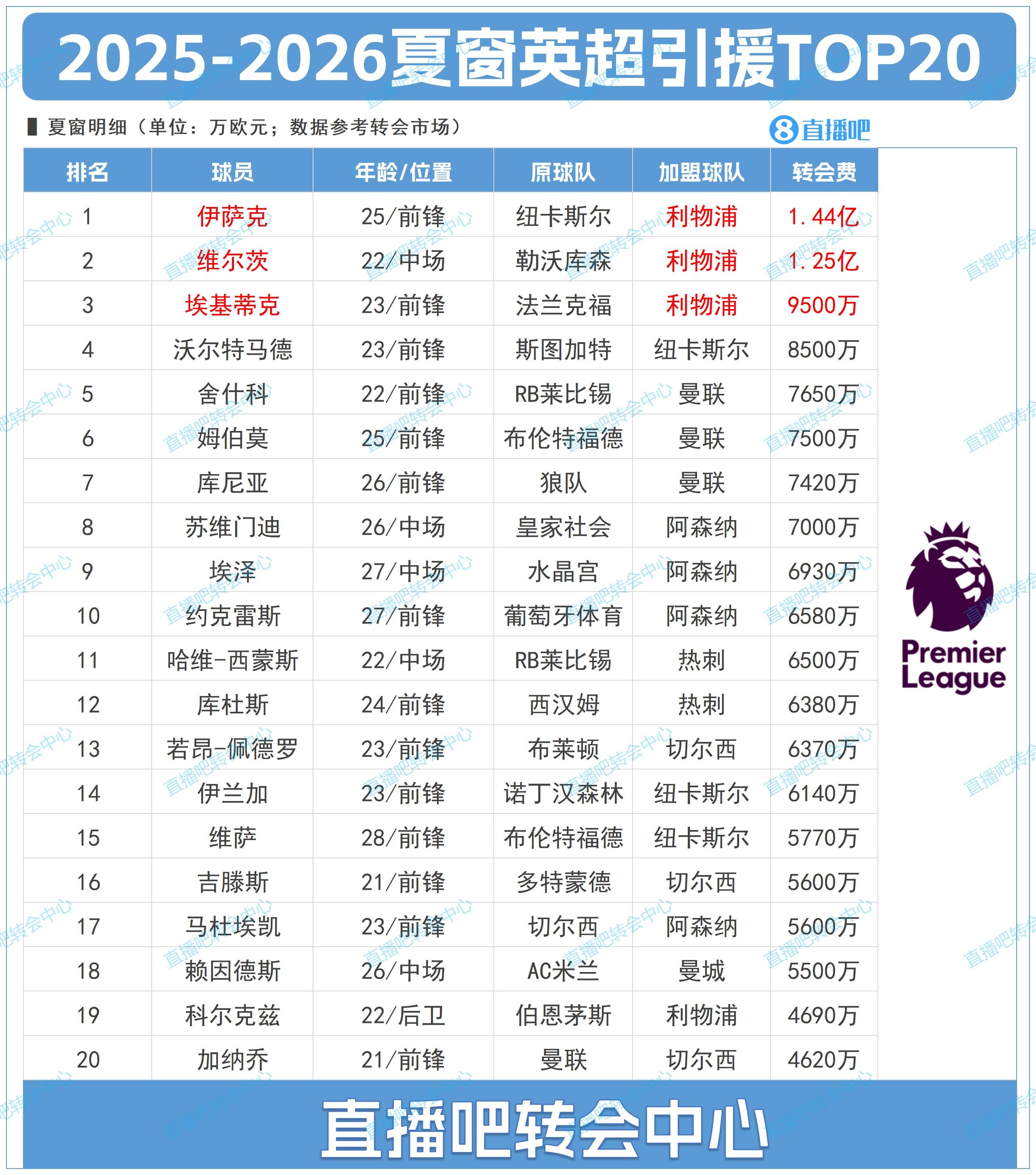 【轉會(huì )中心】為吧友們總結了英超夏窗TOP20轉會(huì )