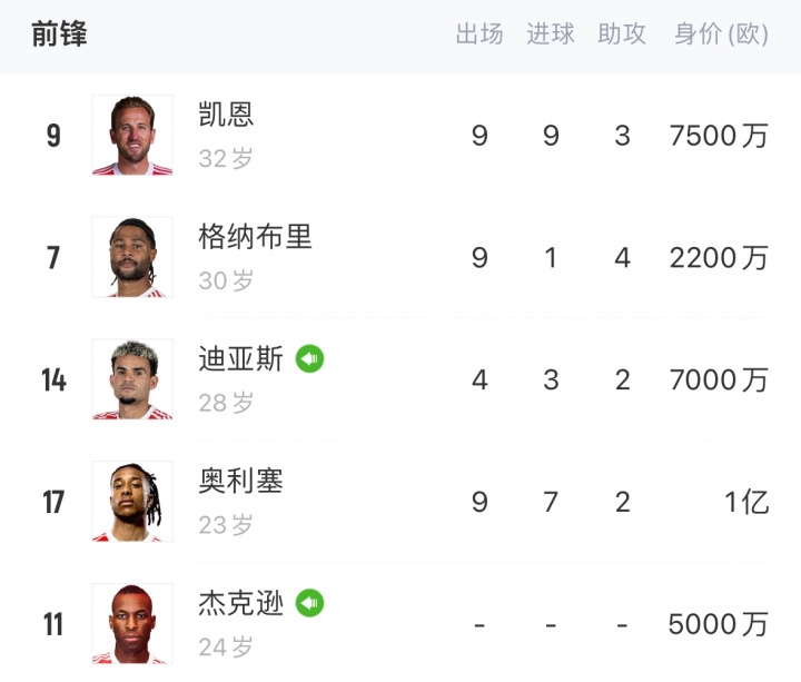 拜仁前場(chǎng)陣容:(不含二隊小將)