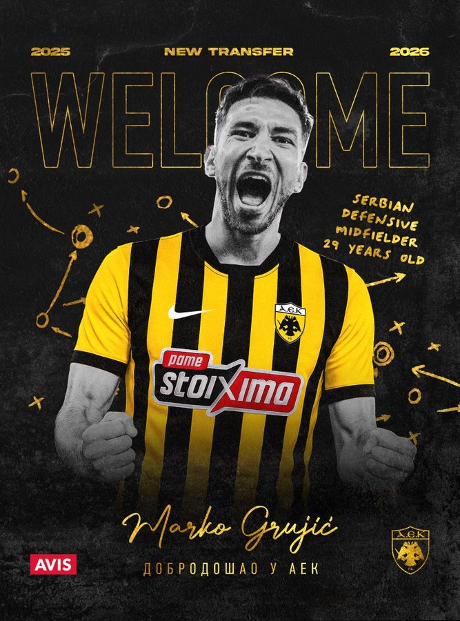 9月2日訊 雅典AEK官宣,俱樂(lè )部簽下塞爾維亞中場(chǎng)格魯伊奇。