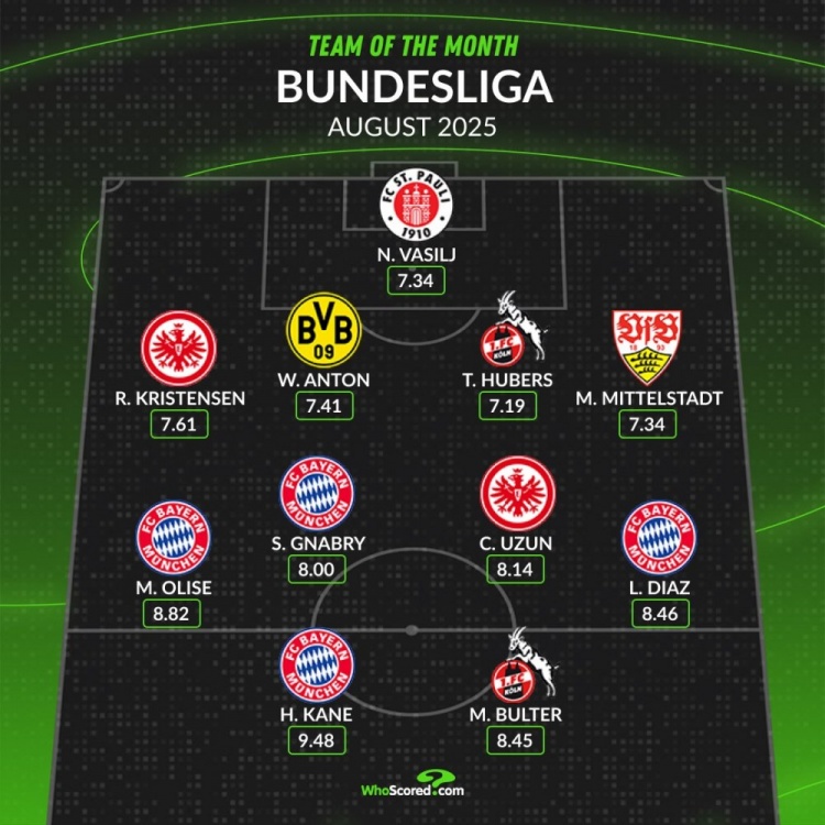 whoscored列德甲8月最佳陣: