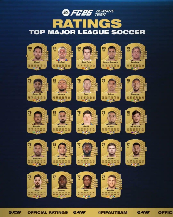 09月03日訊 FC26官方公布美職聯(lián)球員能力值排行,梅西以86的能力值位居第1!德保羅84排第2。