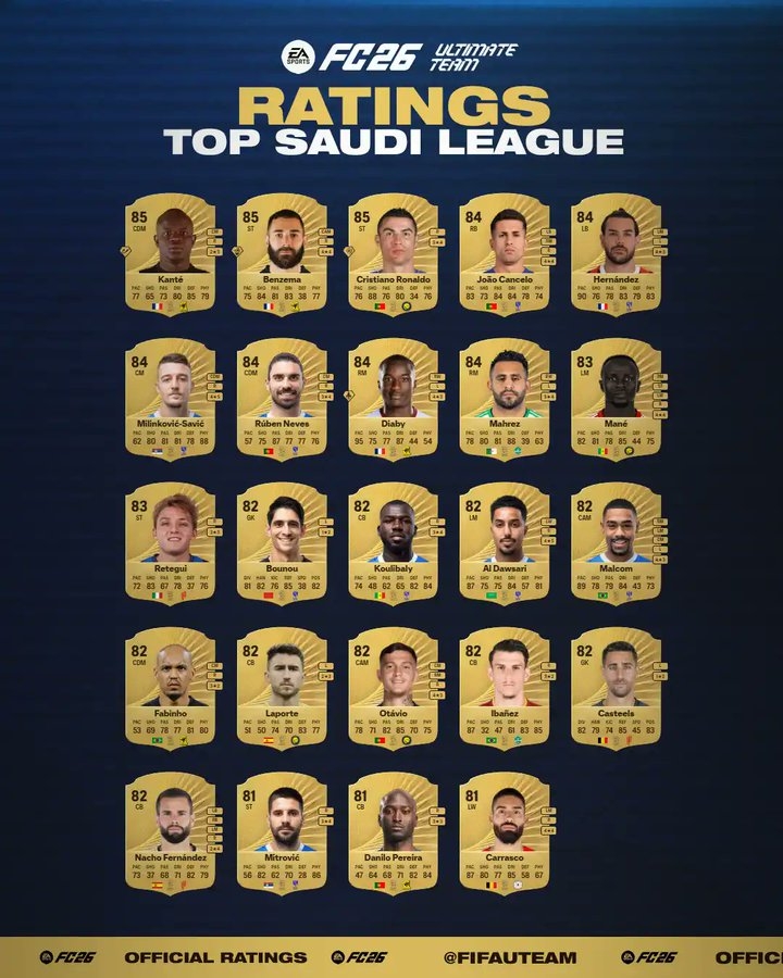 沙特聯(lián)球員FC26能力值排行:C羅、本澤馬、坎特85排并列第1