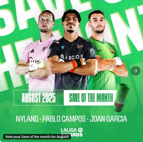 8月最佳撲救中,霍安-加西亞撲出了巴列卡諾的近距離包抄射門(mén),尼蘭德(塞維利亞)撲出了對手的近距離頭球,而巴勃羅-坎波斯則撲出了拉菲尼亞的折射。
