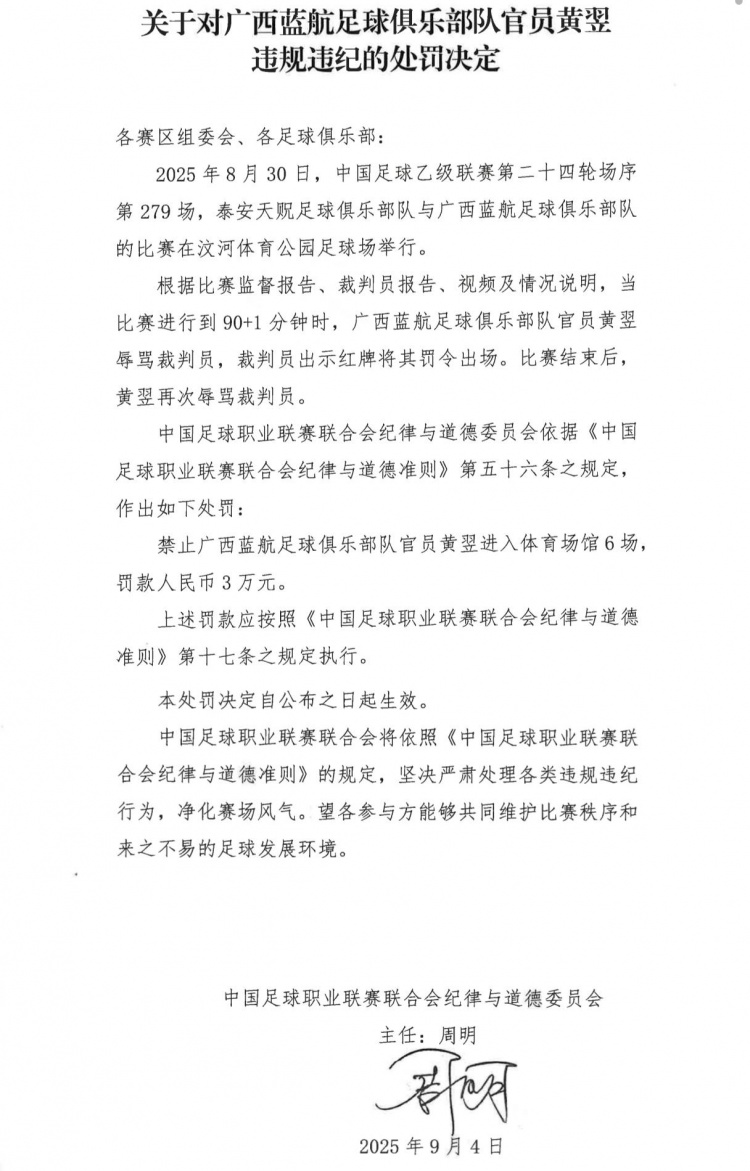 9月4日訊 因辱罵裁判員,廣西藍航俱樂(lè )部官員黃翌遭到了禁賽6場(chǎng)、罰款3萬(wàn)的重罰。