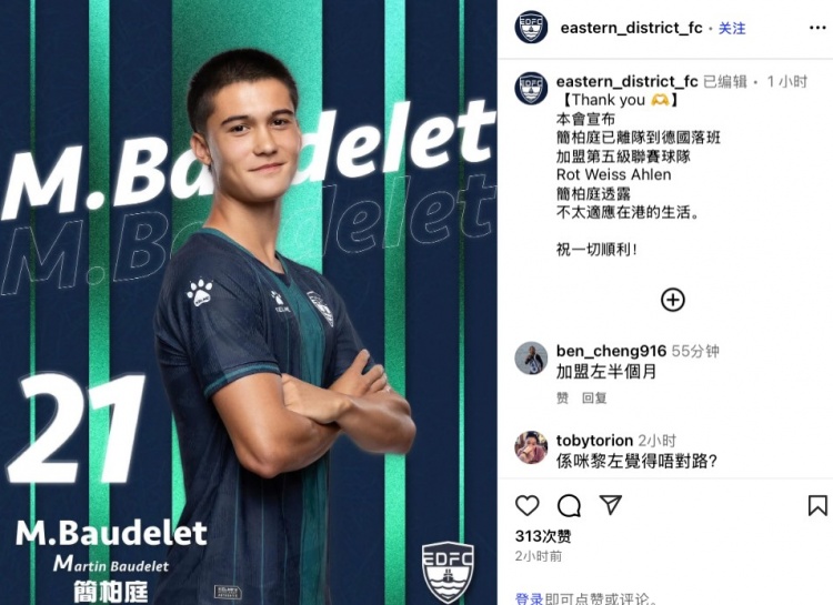 東區俱樂(lè )部在官方ins曬出簡(jiǎn)柏庭的海報,并配文寫(xiě)道:“我俱樂(lè )部在此宣布,簡(jiǎn)柏庭已經(jīng)離隊加盟德國第五級別聯(lián)賽球隊Rot Weiss Allen,據他本人透露他不太適應在中國香港的生活。祝他一切順利!”