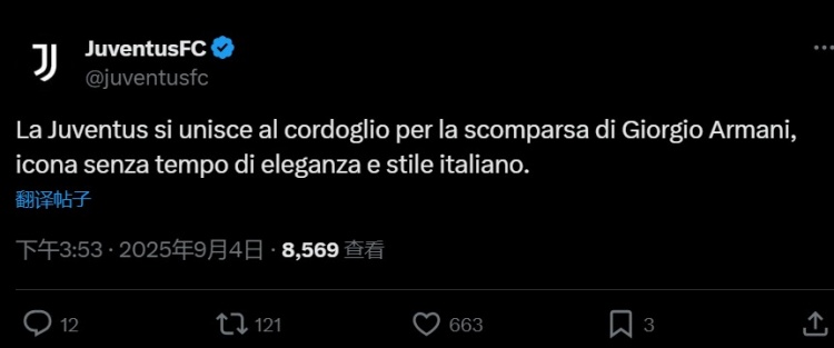 尤文官方寫(xiě)道:“尤文圖斯俱樂(lè )部對喬治-阿瑪尼的逝世表示哀悼,他是意大利優(yōu)雅與風(fēng)格的永恒象征?!?/p>