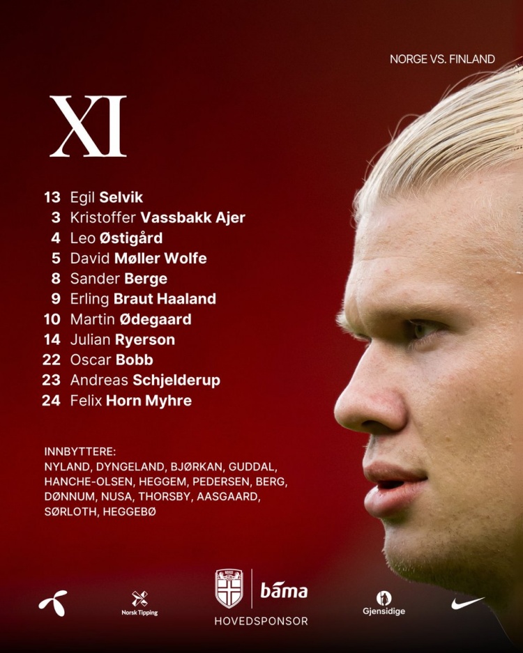 挪威首發(fā):13-塞爾維克、3-阿耶爾、4-厄斯蒂高、5-戴維-沃爾費、8-桑德-博格、9-哈蘭德、10-厄德高、14-萊爾森、22-奧斯卡-鮑勃、23-施耶爾德魯普、24-米赫埃