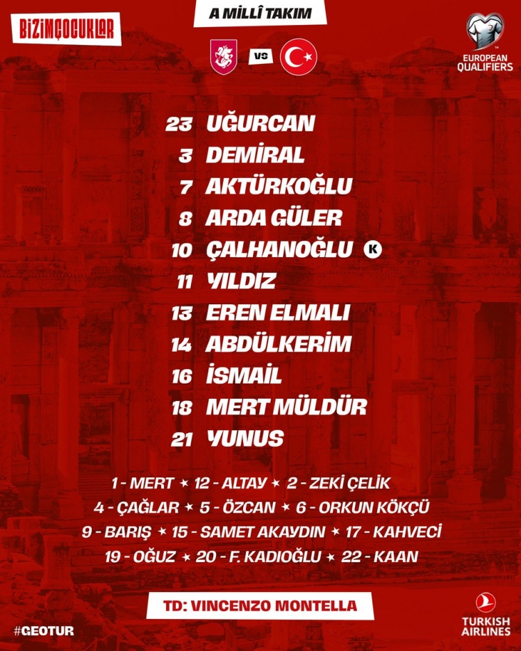 土耳其首發(fā):23-恰基爾、3-德米拉爾、7-阿克蒂爾克奧盧、8-居勒爾、10-恰爾汗奧盧、11-伊爾迪茲、13-埃爾馬西、14-巴達克、16-尤克塞克、18-穆?tīng)柖拧?1-阿克昆