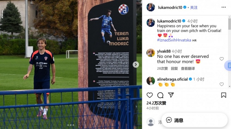 在社交媒體上,莫德里奇寫(xiě)道:在以自己名字命名的球場(chǎng)上隨克羅地亞國家隊一起訓練,你的臉上會(huì )洋溢著(zhù)幸福的笑容。